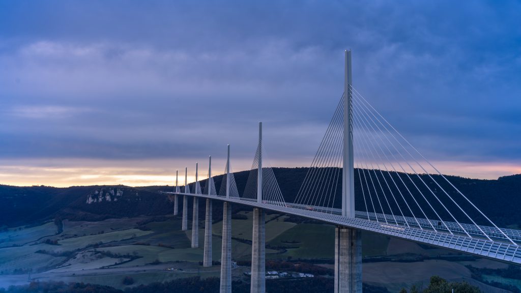Putem afirma cu desavarsire ca Viaductul Millau din Franta este o capodopera a ingineriei. Viaductul strabate 2460 m pester aul Tarn, cu o autostrada cu doua penzi pe sens si alte doua benzi de urgenta. Cel mai inalt dig al podului depaseste in inaltime Turnul Eiffel. Sustinerea podului este realizata de 7 picioare prelungite prin piloni de 87m inaltime, care sunt agitate de 11 perechi de hobane.